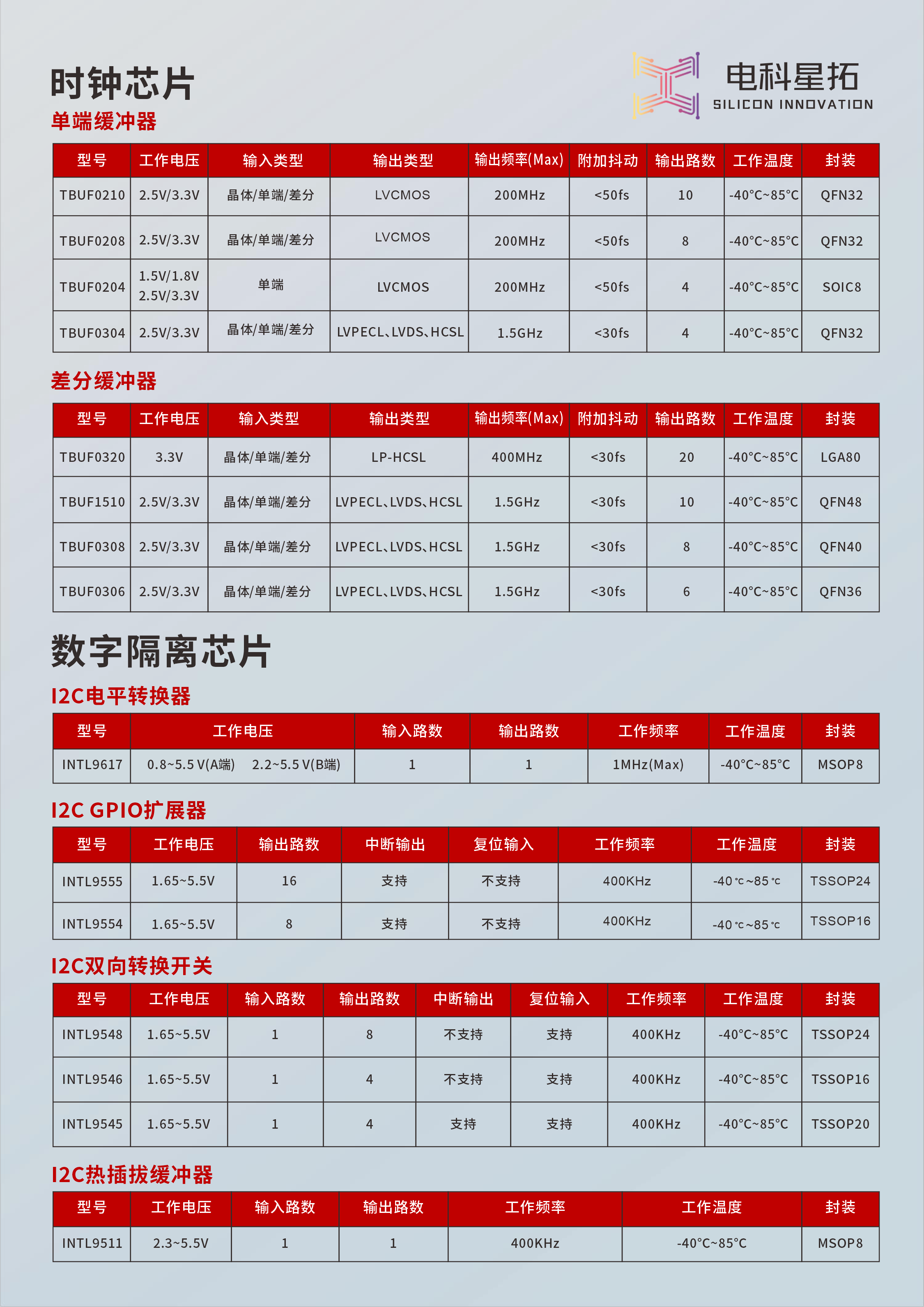 | TBUF0304 | 2.5V/3.3V | crystal/single-ended/differential | LVPECL、LVDS、HCSL | 1.5GHz | <30fs | 4 | -40℃~85℃ | QFN32 |